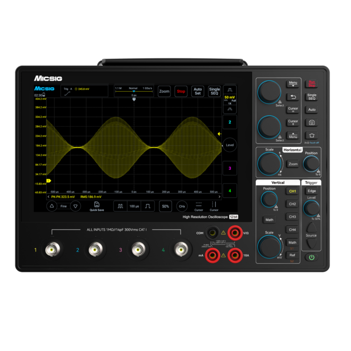 Micsig MHO1 series is an ultra-portable professional-grade high-resolution oscilloscope, equipped with a 12-bit high-precision ADC, featuring a bandwidth of up to 200MHz, 4 analog channels, a real-time sampling rate of 1GSa/s, and a storage depth of 110Mpts.