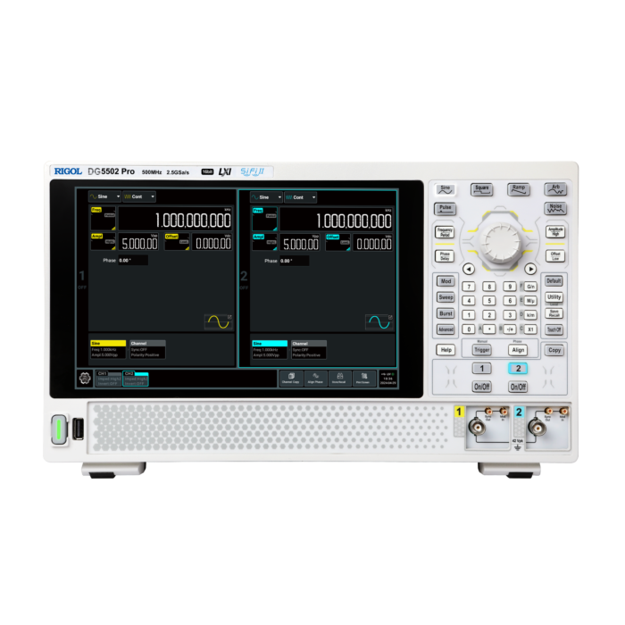 RIGOL DG5000 Pro, a cost-effective next-generation multi-channel waveform generator that packs up to 500 MHz bandwidth, 2.5 GSa/s sampling rate and 16-bit resolution into a compact unit with up to 8 independent output channels. Achieve picosecond-level synchronization and clean, safety-isolated outputs for tackling complex, high-precision multi-channel tests effortlessly. Save valuable bench space and reduce capital costs without compromising performance.